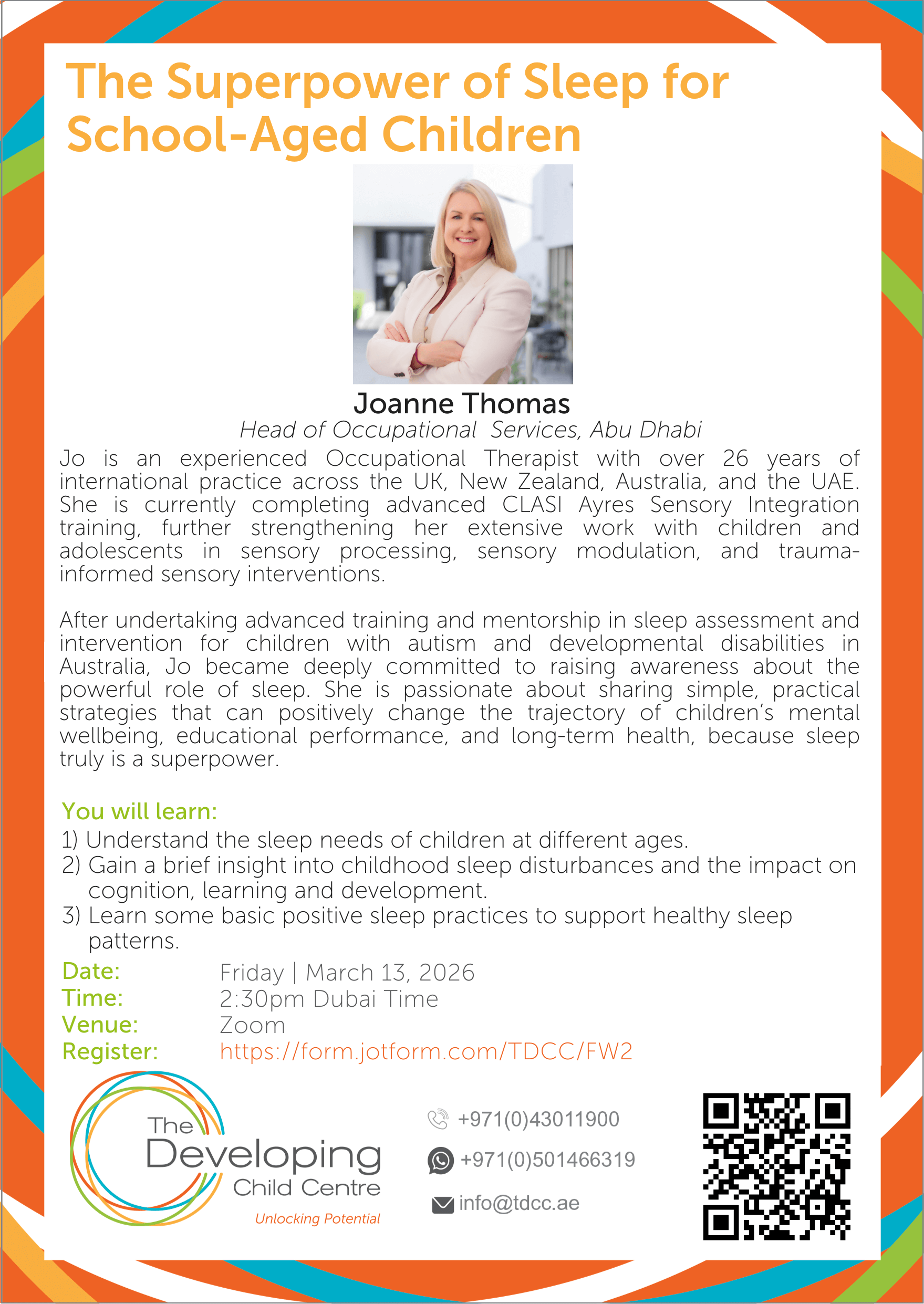 The Developing Child Centre (TDCC) invites parents, educators, and professionals to join an informative online webinar on sleep and child development, led by Joanne Thomas, Head of Occupational Services in Abu Dhabi.